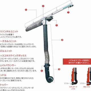 排気ダクトとして機能する排気レールに吊り下げられた排気ホースユニットがレールの端から端まで移動、どの位置でも効果的な排気ガスの排出が行えます。