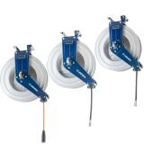 自動巻き取り式ホースリールは、使用したい流体(電気)のホース(コード)を必要な長さだけ引き出し、簡単に使用することができます。ご使用後においてもリールドラムに内蔵したスプリングにより自動で巻き取ることができます。