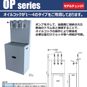 Home / ルブリケーション機器 オイルサービスキャビネットルブリケーション機器 オイルサービスキャビネット OPシリーズ WEBカタログ PDF版カタログ 取扱説明書[AUT 100U-04.pdf] 取扱説明書・組立要領書 ダウンロード 油脂庫に格納された新油のドラム缶と接続することで、オイルコックの操作により新油を必要な量だけジョッキ等へ供給することができます。 オイルコックが1〜4のタイプをご用意しております。 オイルコックの仕様及び取扱説明書はこちらから←ご確認下さい。 この製品へのよくあるご質問 仕様 寸法図 チラシ 仕様 型式 製品番号 オイルコックの数 オイルコックの耐圧 質量 OP-1 881200 1個 5.5MPa 28kg OP-2 881201 2個 5.5MPa 30kg OP-3 881202 3個 5.5MPa 33kg OP-4 881203 4個 5.5MPa 35kg 寸法図 チラシ ◆ OPシリーズチラシ ※画像クリックすると新しいタブで開きます。