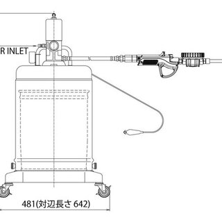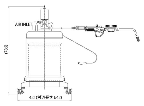 Home / ルブリケーション機器 オイル用ルブリケータールブリケーション機器 オイルルブリケーター SGRシリーズ SGR-55 取扱説明書[900042-09.pdf] 取扱説明書・組立要領書 ダウンロード キャスター付の安定の良い台車に、専用油槽キャビネット、ポンプなどをセットした使いやすい普及型です。 この製品へのよくあるご質問 仕様 寸法図 ホース仕様 〈参考〉ポンプ性能 オイルのセット方法 仕様 製品番号 型式 全高(mm) 容量(L) 質量(kg) 付 属 品 880267 SGR-55 784 20(専用油槽) 16 695052 耐油ホース(1.5m) ・・・1686858 デジタルオイルガン・・・1682905 専用油槽 ・・・1680743 口金PS-20PM・・・1 寸法図 ホース仕様 製品番号 型 式 内径×全長(m) 両端口金 常用圧力(MPa) 695052 SGR-55-1.5m 3/8×1.5 R3/8×R3/8 7 695051 SGR-55-2m 3/8×2 695103 SGR-55-3m 3/8×3 〈参考〉ポンプ性能 ポンプレシオ 最高吐出圧力*(MPa) 最大吐出量*(L/min) 最大空気消費量*(L/min(ANR)) 1.8×1 1.2 7 130 *印は供給エア圧力:0.7MPa、タービン油1種ISO VG32使用、油温26℃の時の参考値です。 オイルのセット方法